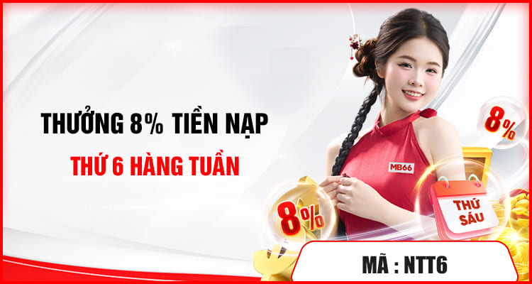 Mọi lệnh nạp tiền của Hội viên vào ngày thứ 6 hàng tuần, Nhà cái mb68z live tặng thêm 8% giá trị tiền nạp. Khuyến mãi áp dụng với mọi phương thức nạp, không giới hạn số tiền nạp.
